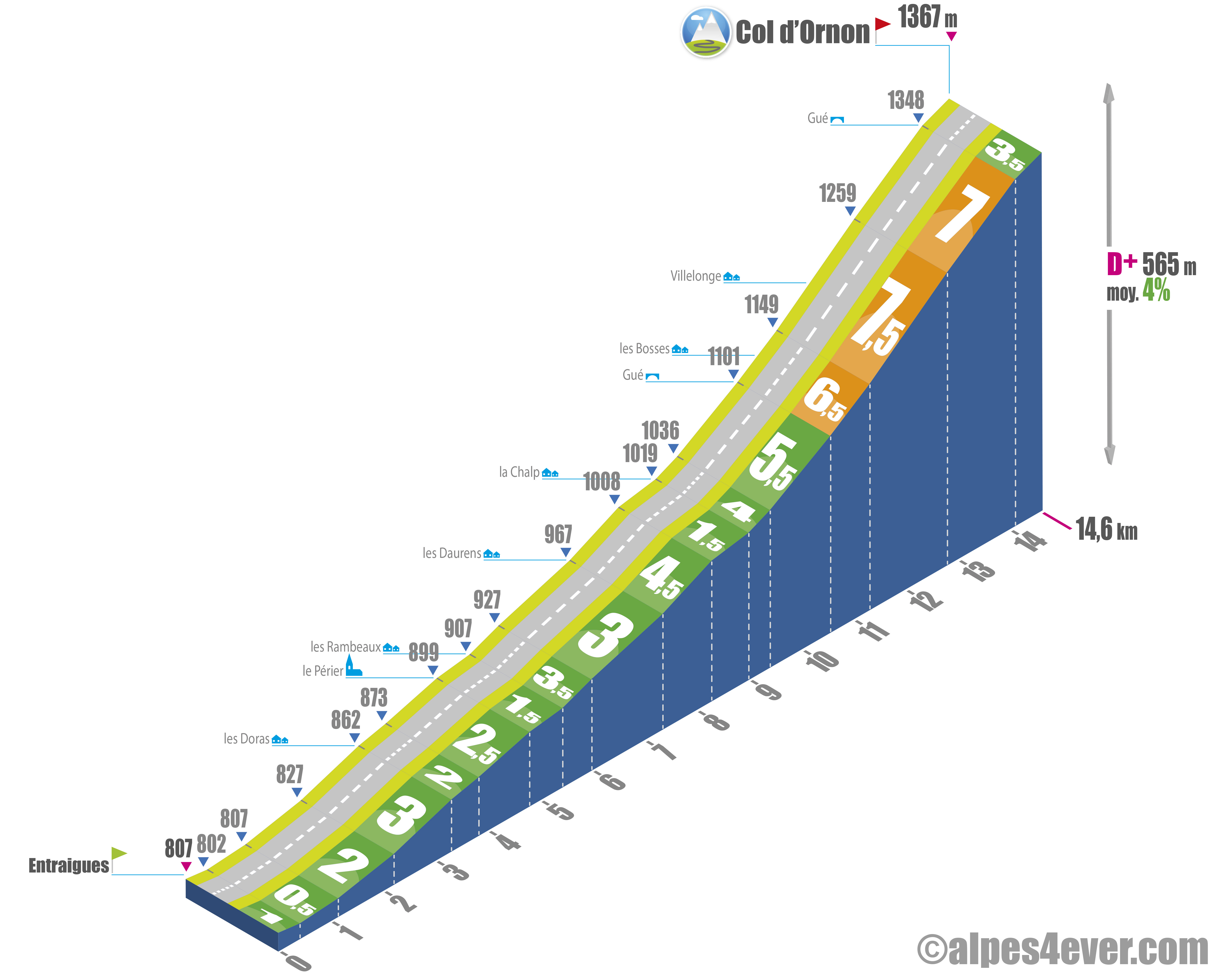 L’ascension débute à Entraigues, sur le versant sud du col, pour une montée de 14,4 km au profil en trois temps.