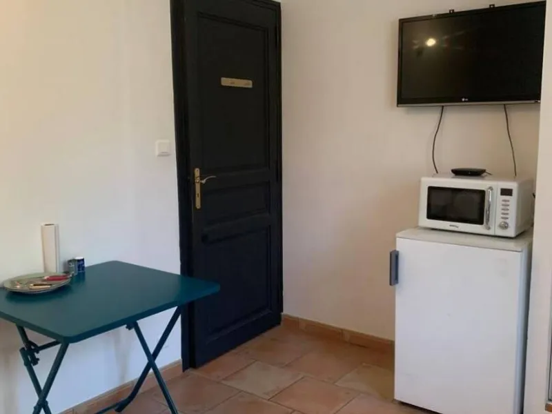 Dans le salon : canapé, télé, table, micro-ondes, frigo.