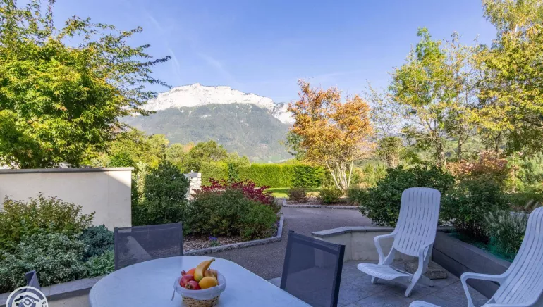 A 3km de Menthon St Bernard, appartement en rez jardin d'une maison dans une propriété offrant une vue exceptionnelle sur les montagnes du Parmelan et des Dents de Lanfon : un écrin de verdure dans un cadre bucolique, calme et reposant.
