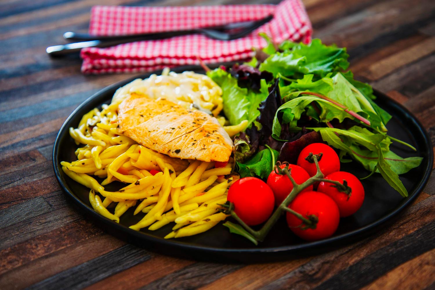 • 25% de protéines maigres : poulet, poisson ou lentilles