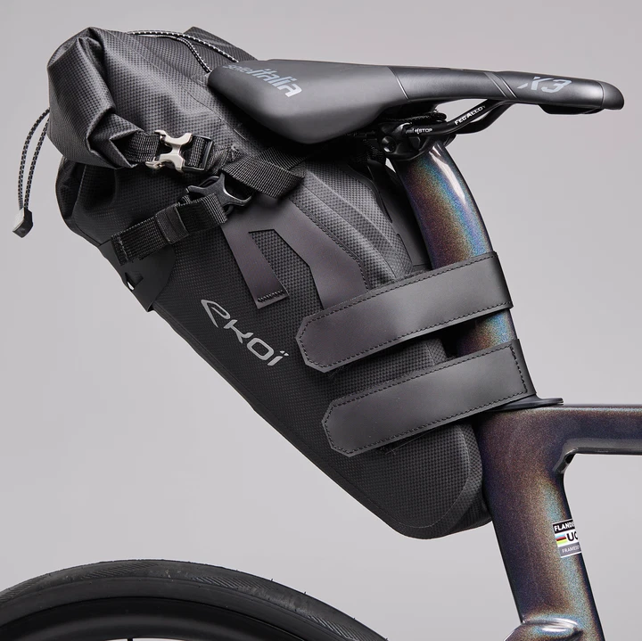 Ekoi propose un kit de bagagerie complet (sacoches arrière + selle + cadre) en matériaux ultra-résistants et étanches.